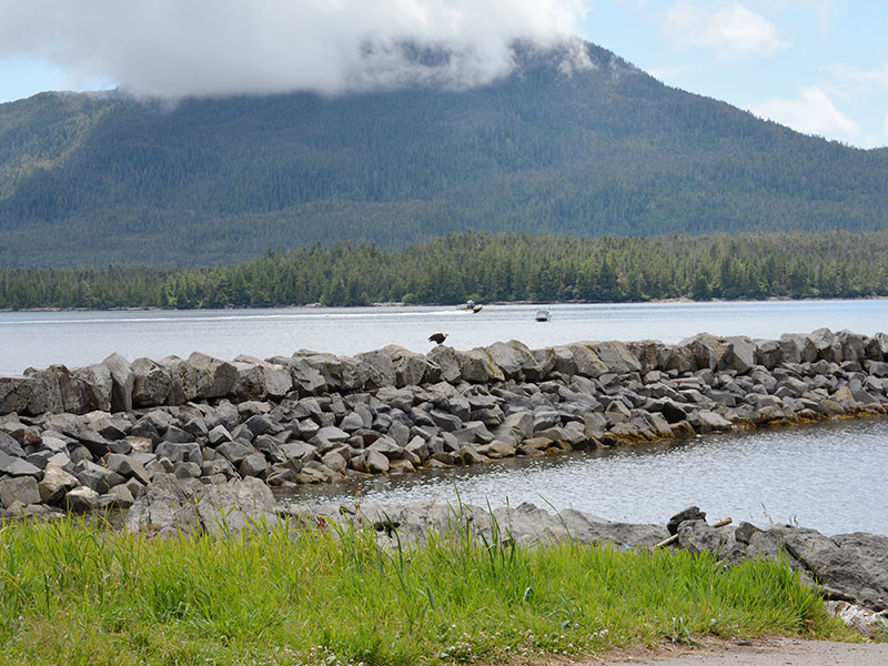 Luckily, we saw a mother bald eagle leave the nest for a bit of a break, and expertly pose on the break-water. Shortly after, we stopped near a local fish hatchery, where King and Coho salmon were running, preparing to spawn. Suddenly, a young black bear came out of the bushes, fishing for his lunch. He hung around for a good 15 minutes, giving us tourists quite a show!