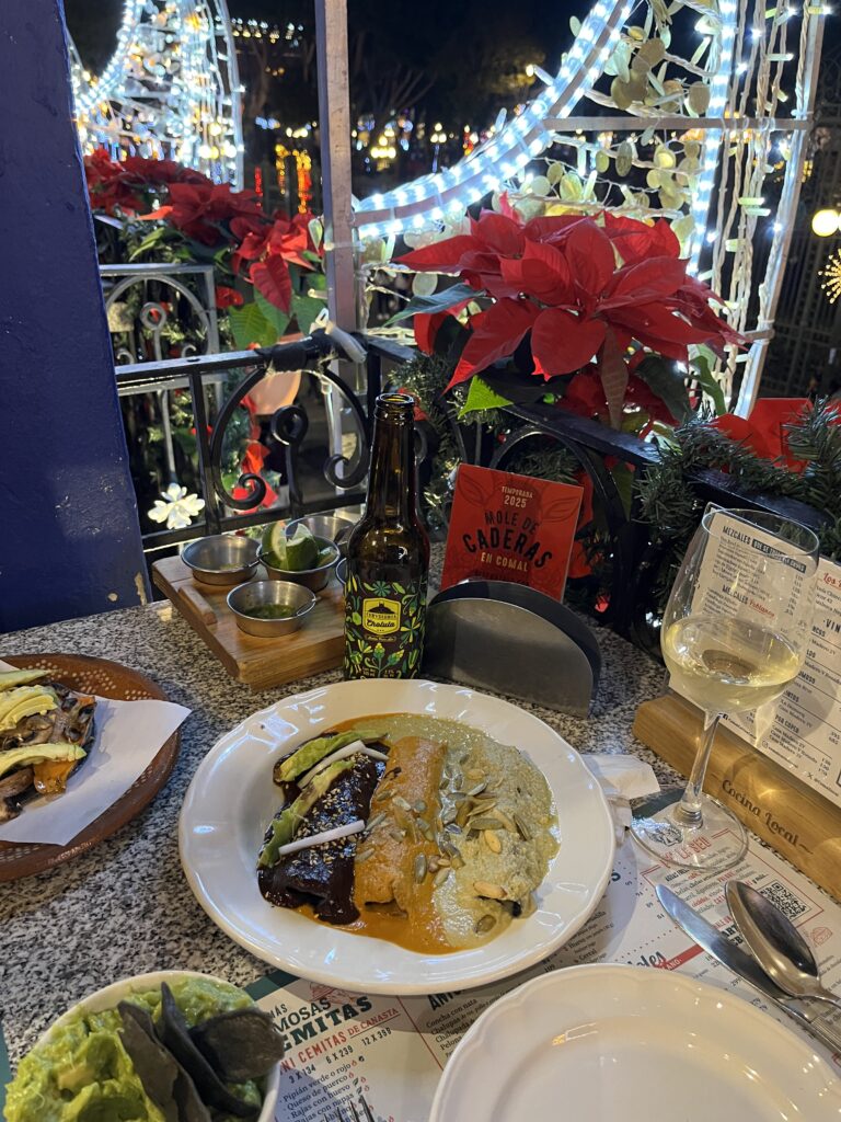 Puebla is a culinary capital, known for its signature dishes like Mole Poblano, a complex chili-and-chocolate sauce, and Chiles en Nogada, featuring poblano peppers topped with walnut sauce and pomegranate. We tried at least 10 different moles; my favourite was at Comal, a restaurant facing the Basílica Catedral de Puebla. If you dine there, try to get one of the tables facing the windows so you can enjoy the beautiful view.