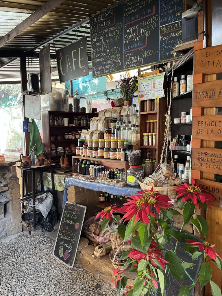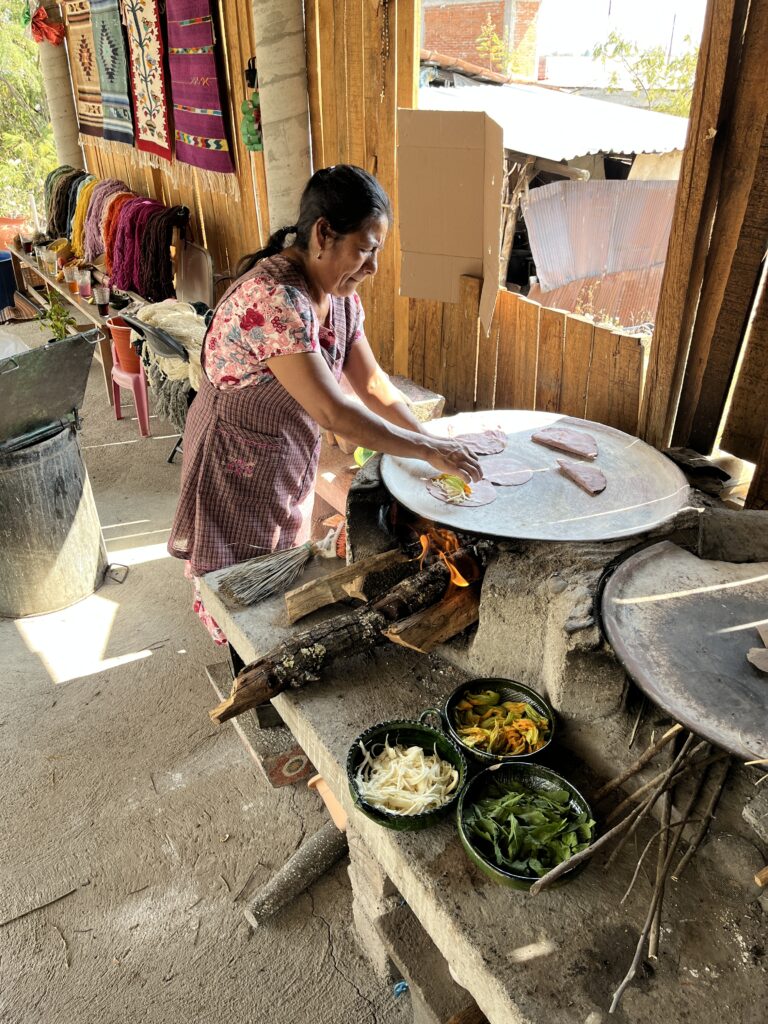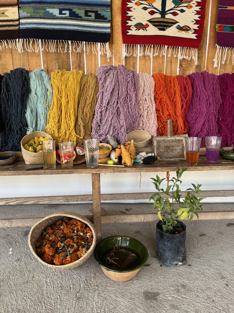 We spent the day with a mother-daughter duo who belong to an association of women entrepreneurs. They showed us traditional weaving and dyeing techniques, using only natural ingredients. They told us that rugs and clothing dyed with ingredients that can be re-used to make multiple colours tend to be cheaper. They ensure nothing goes to waste. They served us a delicious lunch freshly made of tortillas, garden vegetables, and local Oaxacan cheese. During the meal, they showed us photos of their relatives, past and present, and shared the history of their family with us. It was a rewarding experience, learning about customs and craft from this welcoming family.