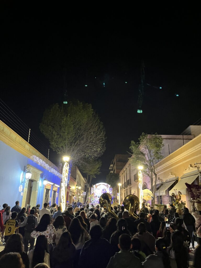 That night, we joined another procession, this time for the Virgin de Guadalupe, a cultural and religious emblem in Oaxaca. Families often dress children in indigenous attire for blessings, and parades fill the streets with music and food around December 12. We watched an impressive mix of fireworks and dance, with locals carrying baskets of fireworks on their heads, and giant papier-mâché figures of the Virgin and other patrons dancing through the streets. It was an astonishing display of fiery colours. Later, we followed a procession with hundreds of locals led by multiple brass bands. It was one of those truly special travel experience.